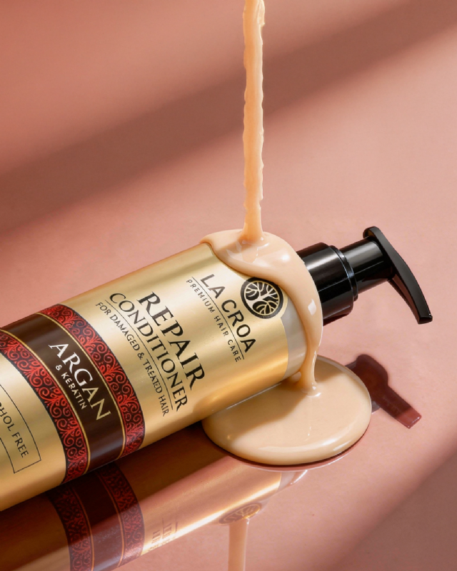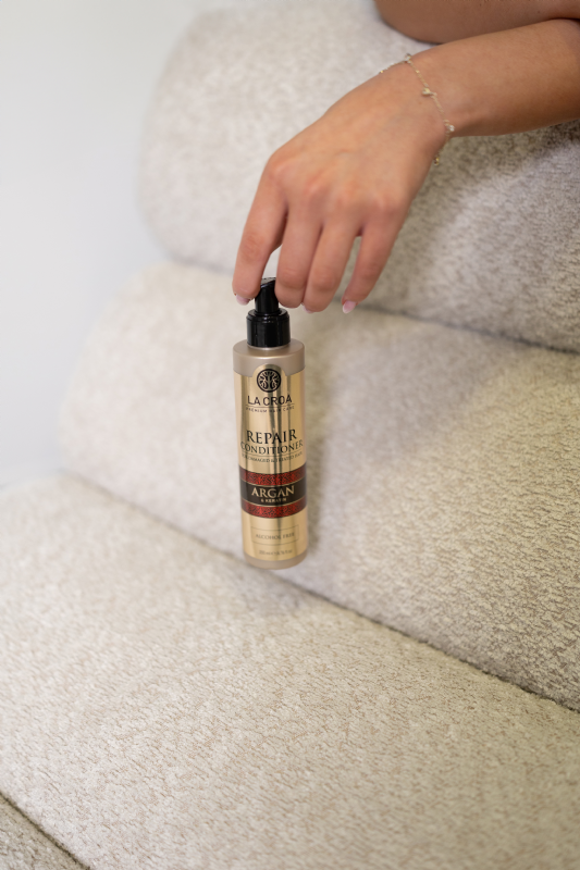 The La Croa Repair Conditioner, enriched with argan and macadamia oils, keratin, collagen, and panthenol, targets damaged areas of the hair fibre, improving structure and elasticity. Provides intense hydration, facilitates detangling, and helps reduce breakage, leaving hair smoother, stronger, and visibly healthier – without weighing it down.