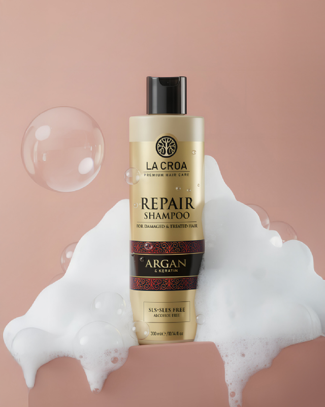 The La Croa Repair Shampoo gently removes impurities and product buildup without harsh surfactants (SLS/SLES-free), helping to prevent further dryness and damage to scalp and hair. Enriched with argan oil and hydrolysed keratin, the shampoo helps restore the hair’s natural barrier, improves elasticity, enhances shine, and maintains optimal moisture and hair fibre structure.