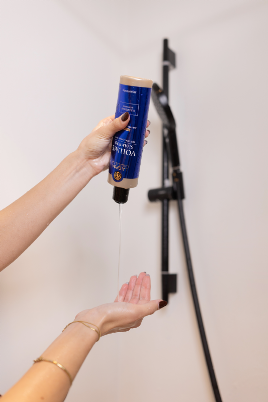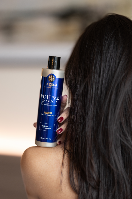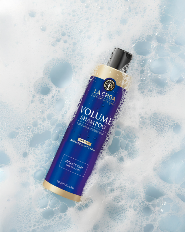 Wet the hair thoroughly, then apply the shampoo and gently massage the scalp with circular motions for 1–2 minutes. Rinse with warm water and repeat if needed. For best results, use together with the conditioner from the La Croa Volume range.