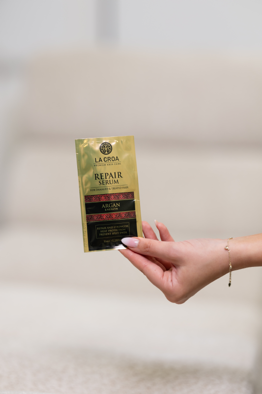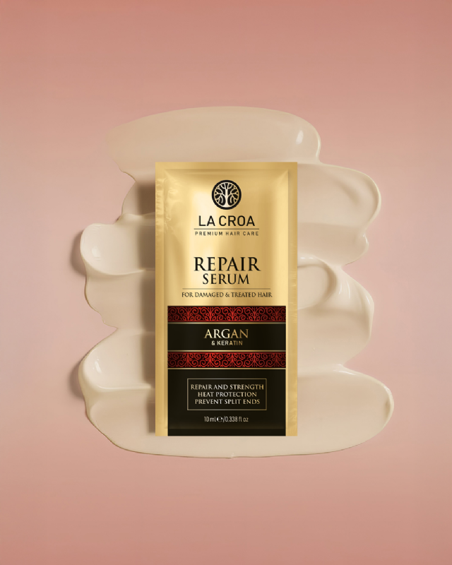 La Croa Repair serum s keratinom i proteinima svile pruža ciljanu regeneraciju i zaštitu oštećenih vlasi. Obogaćen uljem noćurka i uljem koštice grožđa te arganovim uljem, štiti kosu od toplinskih oštećenja, sprječava pucanje vrhova, istovremeno poboljšavajući sjaj i mekoću. Idealno za održavanje zdravlja i otpornosti kose nakon tretmana bojanja, izbjeljivanja ili toplinskog oblikovanja.